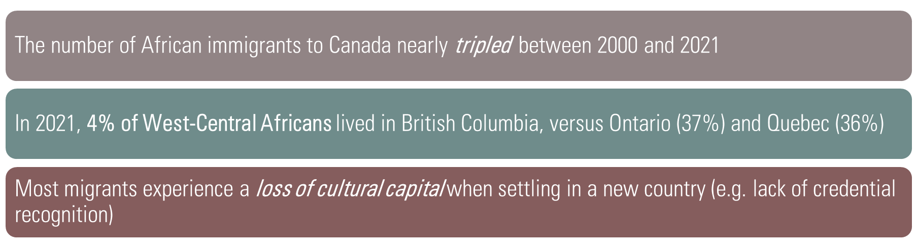- Our study helps extend conceptualizations of hospitality and its application, to foster greater hospitality towards the inclusion of immigrants from West-Central Africa in Metro Vancouver by informing policies and programs.